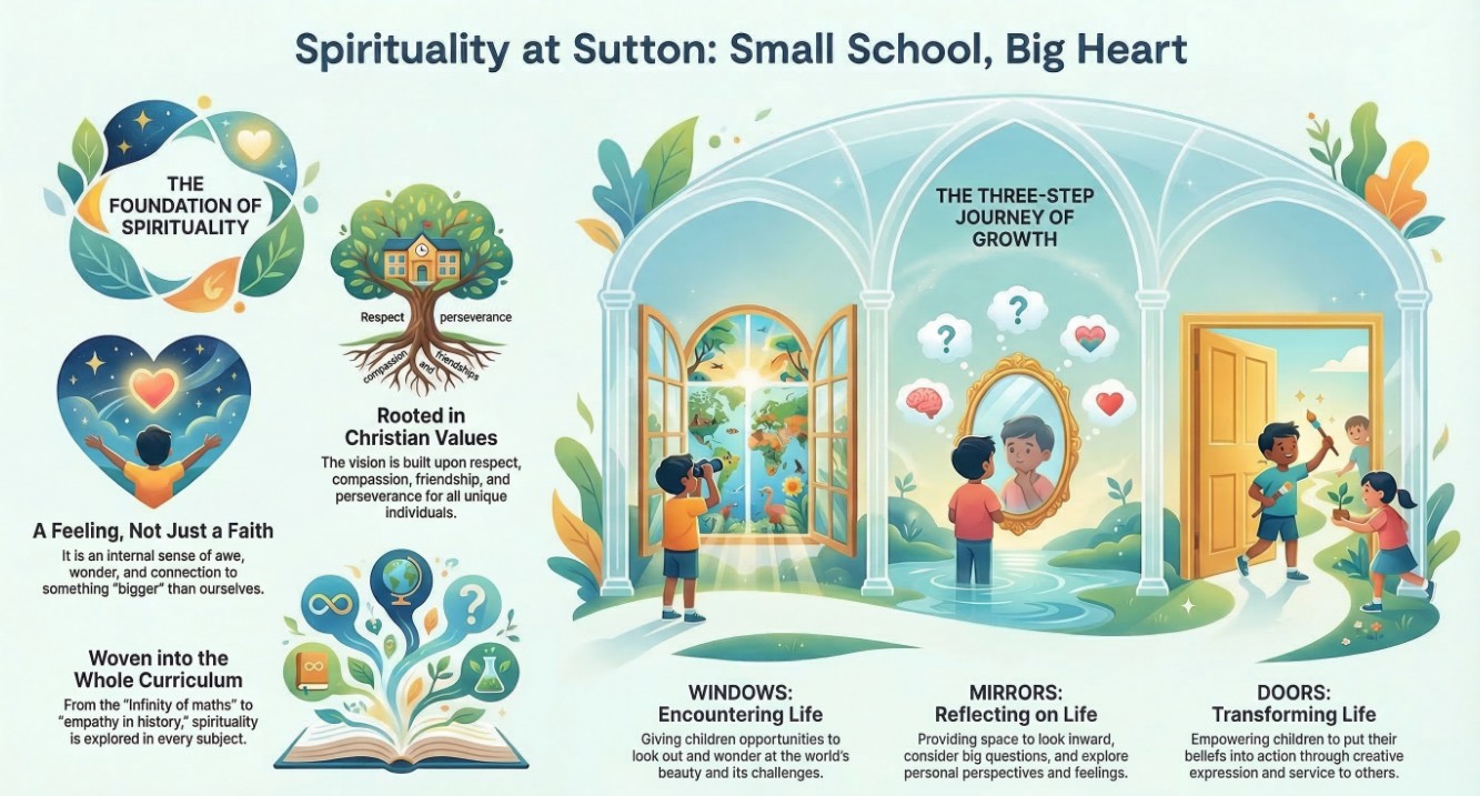 As a Church School, and a place where everyone can flourish, we aim to create an environment that will nurture people’s minds, body and soul. By ‘people’ we refer to all who are part of our Sutton family: children, staff, parents/carers, visitors, governors etc.